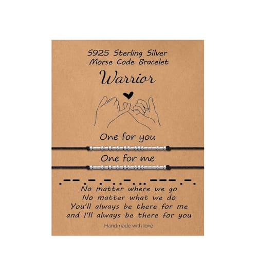 - Pulseira com código Morse: Mensagem de código Morse de prata esterlina S925 "Guerreiro" em uma corrente de cordão. Este é um conjunto de pulseiras para 2, uma para você, uma para mim. Depois de usá-la no pulso, prometo que não importa aonde vamos, não importa o que façamos, sempre estarei lá para você, e tudo ficará OK! Essa é a nossa promessa Pinky!
