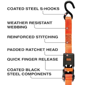 BLACK+DECKER BDX1006 Preto/Laranja 2,54 cm x 30,5 cm Catraca Tiras de Amarração com Alças Acolchoadas (Resistência à ruptura de 0,7 kg) para prender a carga, pacote com 4 - Alças duráveis de 2,5 cm de largura x 2,5 m de comprimento com 226,8 kg. Força de trabalho e 700 g. resistência à ruptura - Ganchos em S revestidos de vinil protegem sua carga e veículo - Confortável, design de cabeça de catraca acolchoada preta - Almofada de liberação texturizada para facilidade de uso - Costura reforçada e tiras resistentes ao clima