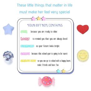 - Embalagem sincera: com surpresa e ideia divertida de presente, o pacote contém 5 pingentes extras (estrela, coração...) que importam na vida, deve fazê-la se sentir muito especial. Um cartão doce e colorido do primeiro dia de aula acalma seus nervos. As explicações especiais dos pingentes na parte de trás do cartão também são uma adição perfeita. Este lindo e único presente de primeiro dia de escola deve trazer um grande sorriso ao rosto dela.