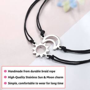 - ?Material e tamanho? -- Esta pulseira é feita à mão de corda resistente com pingentes prateados de lua e sol. O comprimento máximo é de 26,6 cm, adequado para a maioria dos tamanhos de pulsos, basta puxar as cordas para apertar ou soltar a pulseira para um ajuste perfeito.