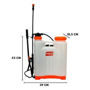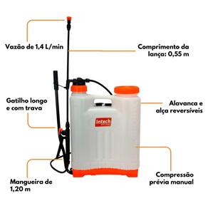 Marca: Intech Machine Modelo: GP2000 Tipo: Costal manual Material da base do reservatório: Polietileno Material da mangueira: PVC Material da câmara de compressão: Polietileno Material do protetor de ombros: Borracha Acionamento da bomba: tipo pistão Sistema de compressão: Compressão prévia alavanca Malha de peneira do reservatório: 0,5 mm a 2,0 mm Pressão de trabalho: 6 bar Comprimento da lança: 56 cm Comprimento da mangueira: 1,2 m Fluxo volumétrico: 1,4 l/min Temperatura máx. de trabalho: 40°C Peso: 2,65 kg