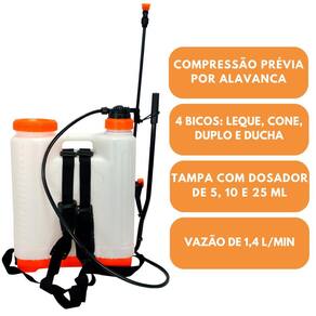 - 4 tipos de bicos: leque, cone, duplo e ducha - Tampa com dosador de 5ml/ 10ml/ 25ml - Alavanca e alça reversíveis - Acompanha Kit de reparos - Mangueira de 1,2 m