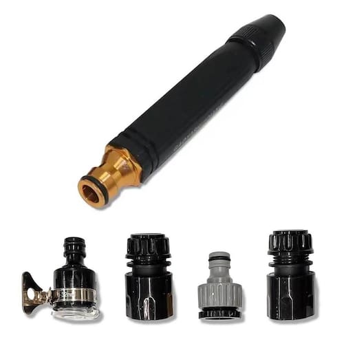 Esse produto é ideal para quem quer cuidar do jardim, com facilidade e qualidade, além de facilitar a hora do banho do seu pet e lavagem do carro. O conjunto é composto por um esguicho com jato regulável e bicos de engates rápidos. O esguicho tem um gatilho que permite controlar a vazão da água, além de um sistema que evita o desperdício. O adaptador para torneira é compatível com as principais bitolas do mercado, e os engates rápidos permitem conectar e desconectar a mangueira com um simples clique. A mangueira é feita de material flexível e durável, que não dobra nem fura. Esse conjunto é o produto que você precisa para deixar o seu jardim mais bonito e saudável.