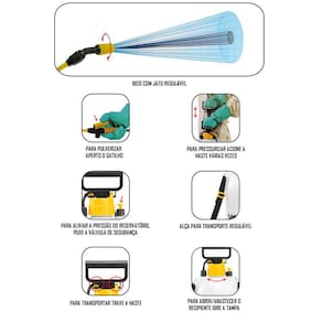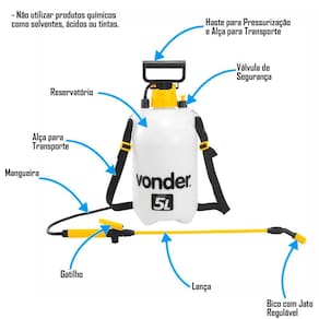 Possui haste para pressurização, bico com jato regulável e válvula de alívio de pressão interna.