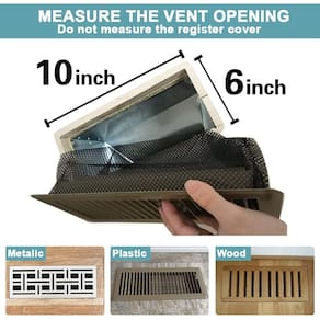 The Air vent Trap is easy to install and perfect for pet keeper and families with kids Household Good-buy Easy to install and adjust Catch debris like pet hair and crumbs Grid design with no restrictions in air flow Catch lost trinkets like toy parts, earrings etc. Stop anything crawling up and out of your vent system Simple and compact, doesn't make the vent stick up off the ground Why is it better than magnetic ones? The magnetic ones will slide off, affect aesthetics of the room and cant' apply on registers of varied material like wood, plastic or metal. Note: Please clean and empty the trap regularly The register trap can be rinsed under running water Please allow slight tolerance in size - ?Save Small Items & Block things Out?!Not for flush mounted registers!The vent mesh is for floor register 6x10. It catches debris,rings, coins, earrings or keys etc., which could fall through the floor vent covers and disappear, thus to keep the ductwork clean.The net grin design could block debris out from the duct or prevent living creatures from crawling in - ?Ensure Ventilation?The vent mesh screen could catch small things while enable good ventilation of the room.Not like those plastic trap or floor vent filters pad that could block air flow and wear out easily. Indeed good vent filters for home - ?Easy to fit in & Remove?No need for any tools, simply fit the floor register mesh trap to the back of the register cover and insert them into the vent. Whatever material of your cover is, The vent register trap will fit perfectly and not easy to loose, when remove, just pull it, save your time and energy - ?Simply but practical?Compact and lightweight but with great durability and practicality. The air vent trap can catch things firmly but not easy to wear and tear. The deep net is design for easy adjustment of the louvers - ?Package & Reminder?Before purchase: for many sizes of vents in your home, please make sure this air vent screen is the right size.Please do regular cleaning of the trap. What you get: 5pack of 6"x10" floor vent trap and 1 month hassle free return or replacement service.