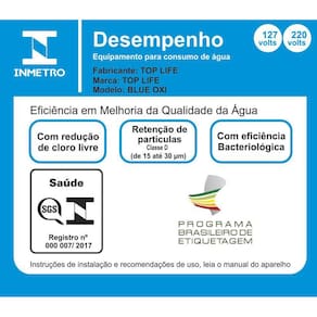 O Purificador De Água Top Life BlueOxi 2 Em 1 Vermelho 220V possui vazão máxima de 45 l/h e vida útil do refil de 3.000 litros. Com um volume interno de 0,24 litros, o aparelho opera com pressão de trabalho entre 3 a 40 m.C.A / 29kPa a 390 kPa. Sua eficiência de retenção de partículas é classificada como Classe D 15 a 30 um . O pH da água é de 8,5 a 9,3 com pH de entrada 7 e o ozônio gerado tem uma média de 0,25 mg/L. A potência do ozônio é de 5 W.