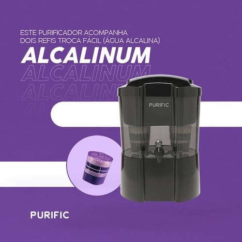 Purificador de água alcalina com 7 camadas de filtragem. Potencializa o pH da água, reduz cloro, vírus, bactérias, partículas, algas, fármacos, metais pesados e trihalometanos. Libera minerais saudáveis. Acompanha dois refis Alcalinum Troca Fácil. Capacidade de 10 litros. Abastecimento manual ou hidráulico (kit não incluso). Livre de BPA e PP-BIP-F.Função retrolavagem