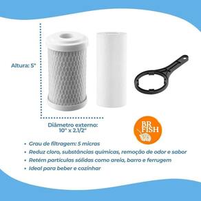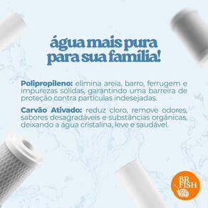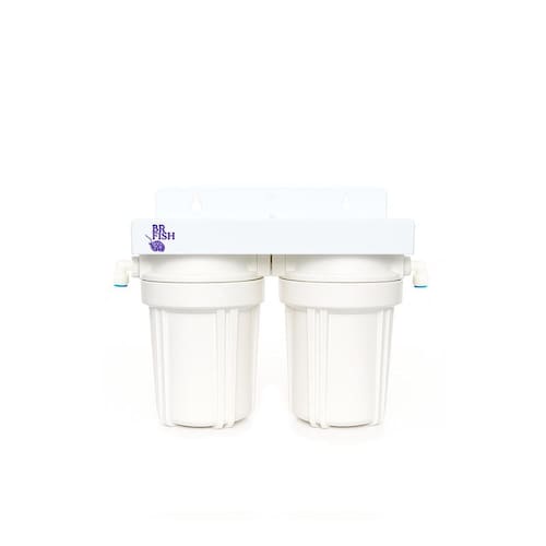 Purificador de água com 2 estágios de filtragem, composto por carcaças brancas e elementos filtrantes de polipropileno e carvão ativado. Inclui mangueira e conectores para instalação.Bica móvel