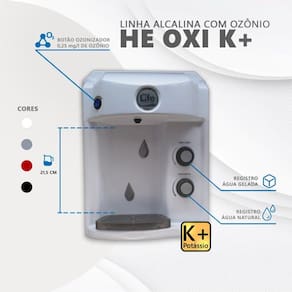 Purificador de água super alcalina ionizada com ozônio e potássio. Possui design moderno e compacto. Libera água ozonizada para higienização de alimentos. Aço inoxidável.Função retrolavagem