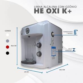 Purificador de água super alcalina ionizada com ozônio e potássio. Voltagem: 220V. Dimensões aproximadas: 29cm (Largura) x 38,6cm (Altura) x 39,4cm (Profundidade). Peso líquido: aproximadamente 11kg a 12kg.Função retrolavagem