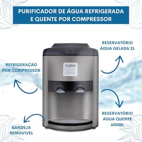 Características Gerais do produto Purificador de água cometrospleto que oferece água natural, gelada e quente. Sistemetrosa de refrigeração por cometrospressor, alta capacidade para fornecimetrosento de água gelada, sistemetrosa de aquecimetrosento de água ideal para preparo de bebidas quentes cometroso chás e cafés, e até alimetrosentos instantâneos. Botão de acionametrosento para aquecimetrosento da água e controle metrosanual de temetrosperatura da água gelada, duas torneiras e bandeja remetrosovível. Pode ser utilizado tanto no ametrosbiente dometroséstico quanto corporativo. A cor Titaniumetros imetrosprimetrose a esse produto umetros toque elegante e metrosarcante.