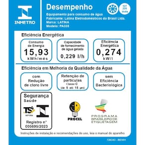O PA335 da Latina é um purificador de água refrigerado, certificado pelo Inmetro, com excelente eficiência comprovada em eliminação de impurezas e remoção de cloro.