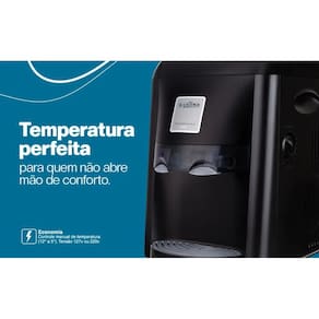 Purificador de água com refrigeração por compressor, duas torneiras (água natural e gelada), controle manual de temperatura ajustável de 5°C a 12°C, filtro bacteriostático com carvão ativado de coco de babaçu, bandeja removível, alta eficiência energética, ideal para uso doméstico e comercial.Bica móvel