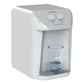 Purificador de água com compressor, refil alcalino (pH > 8.5), estrutura em ABS e acabamento em acrílico. Vazão nominal de 60 L/h, redução de cloro livre, Classe C de retenção de partículas. Vida útil do refil de 3.000 litros ou 6 meses.Função retrolavagem