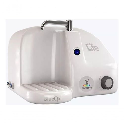 Purificador de água Top Life Blueoxi 2 em 1, alcalina com ozônio. Possui 8 etapas de filtragem, eleva o pH da água entre 8.5 e 9.5, e conta com tecnologia de ozônio para eliminar impurezas, bactérias, vírus e fungos.Função retrolavagem