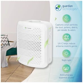AR MAIS LIMPO E FRESCO O design portátil e compacto do purificador permite que você conecte facilmente a tomadas de parede verticais em pequenos espaços em sua casa Perfeito para espaços como banheiros, pequenas lavanderias e áreas para animais de estimação. DILHA ALÉRGICOS O filtro captura grandes partículas transportadas pelo ar, como poeira, pólen, esporos de mofo, detritos e pelos de animais. O design do filtro Guardian Technologies melhora a qualidade do ar interno COMBATE GERMES A luz UV C integrada reduz bactérias, vírus e esporos de mofo transportados pelo ar e trabalha com dióxido de titânio para reduzir compostos orgânicos voláteis REDUZ ODORES A camada de filtro de carbono ajuda a eliminar odores domésticos comuns de fumaça, animais de estimação, vapores de cozinha e bactérias. Para um frescor adicional, basta adicionar uma gota do seu óleo essencial PureGuardian favorito à bandeja de óleo essencial vendida separadamente BRILHO DA LUZ NOTURNA OPCIONAL Ilumine convenientemente os espaços escuros com a luz noturna embutida opcional.