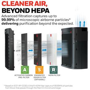 O console Honeywell HPA5100 da Série InSight HEPA Air Purifier ajuda a fornecer ar mais limpo e fresco em ambientes médios e grandes. Com filtração HEPA, que captura até 99,97% de alérgenos e partículas como poeira, pólen, pelos de animais, ácaros e fumaça. Este purificador de ar da Honeywell pode filtrar e circular o ar a cada 12,5 minutos, eliminando odores e partículas nocivas. Além disso, inclui um Display InSight que ilumina para mostrar os 4 níveis de limpeza, um timer automático de desligamento em 2, 4 ou 8 horas, e opção de ajuste de brilho para as luzes do painel de controle. Parte da Série InSight, este purificador de ar Honeywell ganhou a certificação ENERGY STAR por sua eficiência energética. Recomenda-se sempre adquirir filtros de reposição genuínos da Honeywell para garantir a captura eficaz de odores e alérgenos microscópicos. Esteja preparado para substituir os filtros True HEPA R 1 vez por ano e o Pré-Filtro Redutor de Odores 4 vezes por ano.