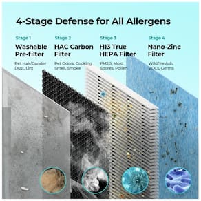 O purificador de ar inteligente Homvana H211S é uma escolha poderosa para salas de até 379,94 metros. Com um CADR de pico de 142 CFM, ele limpa o ar em 82,07 metros em 12 minutos, 196,05 metros em 30 minutos e 379,94 metros em 60 minutos. O filtro HEPA verdadeiro de 4 estágios H13 ajuda pessoas com asma e alergias, capturando 99,97 contaminantes transportados pelo ar de 0,1 mícron, como poeira, pólen, fumaça e pêlos de animais, etc. O sensor infravermelho avançado permite que você veja a qualidade do ar em tempo real e como o ar melhora através dos indicadores distintos ou do aplicativo Homvana. O modo de suspensão Homvana é tão silencioso quanto 22,0 DB, ainda mais silencioso que um sussurro, permitindo que você desfrute de um sono tranquilo.