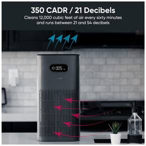Purificador de ar com filtro HEPA 13, capaz de limpar salas grandes com capacidade de purificação de 350 mh CADR. Possui três opções de filtro (padrão, especial e premium) que visam partículas, pólen, odor, fumaça, cinzas, cheiro de fumaça e formaldeído. Sensor de poeira a laser verifica a qualidade do ar, medindo partículas de até 0,3 mícrons e ajustando automaticamente. Nível de ruído de 21,0 DB no modo de sono e 54,0 DB no modo alto. Controles inteligentes com rastreamento AQ interno e externo detalhado e controle remoto.Função retrolavagem