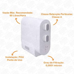 Este aparelho purifica a água através da tecnologia de osmose reversa, garantindo uma água extremamente pura. Retém partículas maiores que 0,0001 mícron, garantindo assim uma água livre de sais, dureza, vírus, bactérias, entre outras substâncias nocivas à saúde humana.