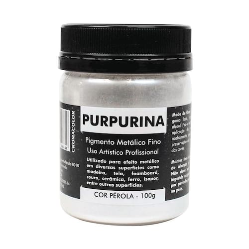 Purpurina Cromacolor é um pigmento utilizado para efeitos metálicos em diversas superfícies como madeira, tela de pintura, gesso, cerâmica, foam board, couro, isopor entre outras superfícies. Também utilizada na recuperação de peças com efeito metálico ou pátina.