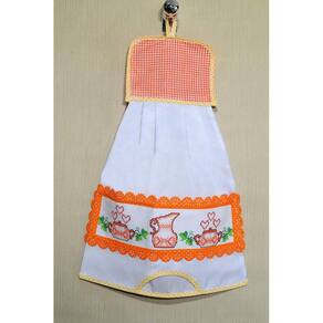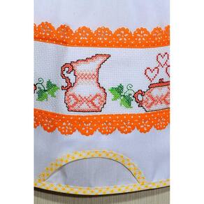 Puxa saco confeccionado com tecido tergal na cor branco, com barrado bordado em ponto cruz de duas panelas, uma jarra e vários corações, detalhes em laise na cor laranja de bolinha brancas, e também xadrez laranja .