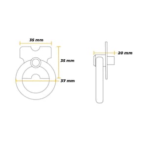 Medida Ø furo: 3/16” Dimensões: 35 x 23 mm espelho e Ø37 mm de argola Material: Zamac Fixação: Parafuso Comercializado: Unidade