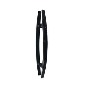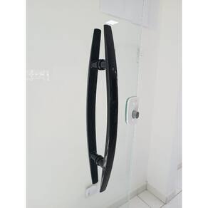Especificações Técnicas Marca: R. Sabatini Modelo: H Curvo 5030 Cor: Preto Material: Resina Sintética e Aditivos UV Auto adesivo: Não Espessura do vidro: Portas de Vidro de 8 à 12 mm Uso indicado: Para abertura de portas pivotantes e de deslizar Quantidade: 01 Par lado interno e externo Medidas do puxador: 500 mm x 300 mm 50 cm entre furos 30 cm