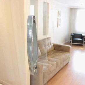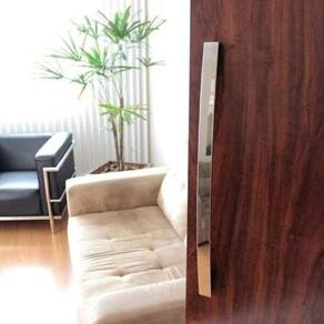 Puxador duplo em aço inox 304, acabamento polido, indicado para portas de madeira e vidro. Modelo: Duplo Acabamento: Polido Material: Inox 304 Furação: 400 mm Tamanho: 40x500 mm