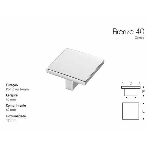 Puxador : firenze 40x40mm Marca: Gruppa Furação: Ponto ou 16mm Largura: 40mm Comprimento: 40mm Profundidade: 19mm Acabamento: Cromado Ean: 7897889800950