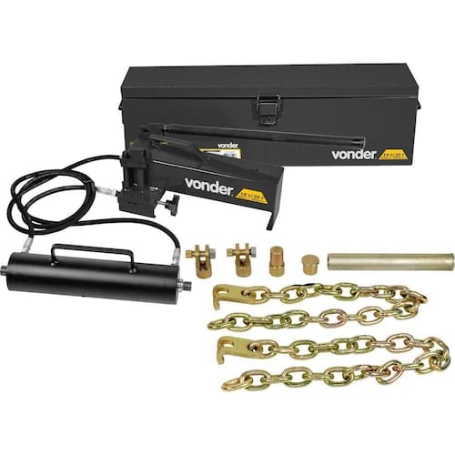 1 Esticador/puxador hidráulico para lataria, acompanha: 1 bomba hidráulica, 2 correntes com ganchos e suporte, 1 tubo prolongador de 305 mm, 1 prolongador do pistão de 70 mm, 1 sapata para o pistão, 1 pistão hidráulico e 2 mangueiras de pressão