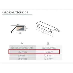 Puxador em alumínio para móveis firenzedescrição técnica:- material: alumínio- modelo: firenze 7015- puxador angulo 45º- medidas disponiveis: 82mm furo a furo 64mm , 146mm furo a furo 128mm , 210mm furo a furo 192mm disponível em outros anuncios - espessura: 1,3mm- parafuso para instalação: 4,0 x 16mm não inclusos características: puxador ideal para qualquer tipo de móvel. Funciona em portas de bater ou de correr ou frentes de gavetas com limitide máximo de espessura em 18mm da porta/gaveta.Diferencial:puxador primeiramente é cortado depois tem suas pontas abauladas, escareado na parte traseira e posteriormente lixado, após todo esse processo recebe a anodização/pintura, por isso ele é 100% na cor, até mesmo as laterais. Opções: Cores disponíveis em outros anúncios: preto, anodizado cinza , inox escovado bronze claro , rose gold cobre , branco e dourado Medidas disponiveis em outros anuncios : 82mm furo a furo 64mm , 146mm furo a furo 128mm , 210mm furo a furo 192mm