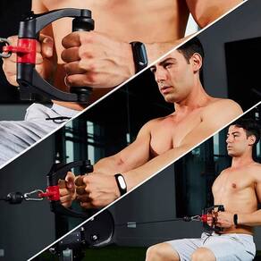 Compatível com máquinas de cabo e faixas de resistência, ele permite trabalhar diversos grupos musculares: Peito, Costas, Ombros, Bíceps e tríceps e Até exercícios para a parte inferior do corpo