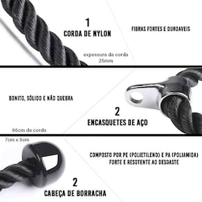 Puxador Corda Tríceps Cross Over, material resistente para complementar na prática de exercícios em Estação de Musculação Residencial e Profissional, bem resistente suportando uma carga de ate 250 kg com presilha de aço cromado, ele proporciona segurança total durante a execução de exercícios como tríceps pulley, bíceps, abdominais, e muito mais.