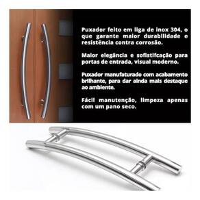 Material: aço inoxidável Acabamento: polido ou escovado, escolher após a compra Formato: curvo / tubular bellíssima Tamanho: 30 cm Distância entre furos: 20 cm Fixação: parafusos inclusos Aplicação: portas pivotantes de alumínio ou vidro ou madeira Durabilidade: alta