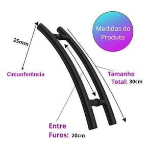 Material: aço inoxidável Acabamento: escovado Formato: curvo / tubular bellíssima Tamanho: 30 cm Distância entre furos: 20 cm Fixação: parafusos inclusos Aplicação: portas pivotantes de alumínio ou vidro ou madeira Durabilidade: alta