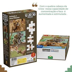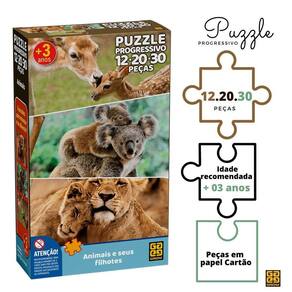 Puzzle Progressivo Animais e seus Filhotes Com 3 quebra-cabeças que contém simpáticas figuras de alguns animais e seus filhotes. A criança monta os quebra-cabeças e se diverte com a carinha dos personagens. Ao final da montagem, os três puzzles se complementam, formando uma grande e linda imagem dos animais. O Puzzle Progressivo traz na mesma caixa três quebra-cabeças diferenciados, em que as quantidades e os tamanhos das peças determinam níveis crescentes de dificuldade. As peças do verso também são diferentes, para facilitar a separação dos modelos. Inicie a montagem pelo quebra-cabeça de 12 peças, a fim de que a montagem das ilustrações de 20 e 30 peças ofereça um desafio progressivo e atraente.