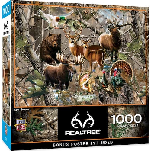 MasterPieces Quebra-cabeça de 1000 peças para adultos, família ou jovens - Temporada aberta - 49 cm x 68 cm - Acabamento fosco – Nosso acabamento fosco ajuda a reduzir o brilho para uma melhor experiência de quebra-cabeça. Aqui está o que é apresentado nesta coleção Realtree - adoráveis animais da floresta. - Corte aleatório - Todos os quebra-cabeças Masterpieces têm formas variadas para criar uma variedade com peças interligadas apertadas e grossas. Garante uma variedade de desafios com cada quebra-cabeça! A maneira perfeita de manter a noite de jogo divertida. - Ecológico - Nossos quebra-cabeças são feitos de material 100% reciclado e não tóxico, tintas à base de soja para diversão ecológica! - Pôster bônus - Este quebra-cabeça vem com um pôster para uma visão ampla e detalhada para ajudar a guiar os quebra-cabeças na resolução deste quebra-cabeça. Criamos quebra-cabeças usando um tabuleiro grosso em uma ampla variedade de peças para crianças e adultos desfrutarem!