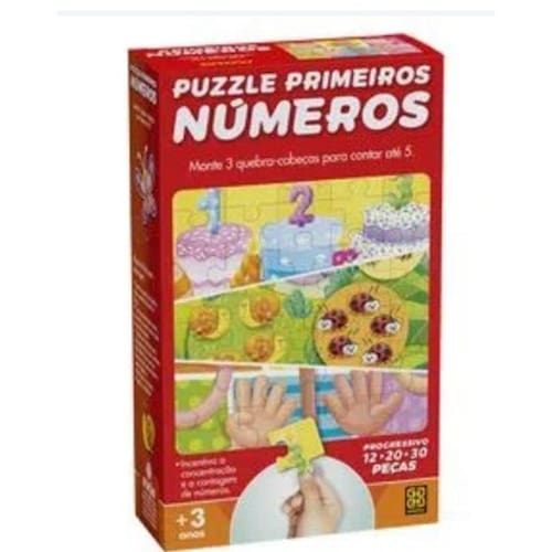 O Puzzle Progressivo Primeiros Números traz três quebra-cabeças com quantidade de peças e tamanhos diferentes, com níveis de dificuldade crescentes e adequados à idade da criança. As peças do verso também são diferentes, para facilitar a separação dos modelos.