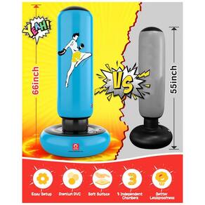 TAMANHO IDEAL: com 168 cm após inflar completamente, foi projetado para crianças a partir dos 6 anos, estimulando o tempo de qualidade em família. Sua base tem 79 cm de diâmetro, maior do que a maioria dos sacs de pancada no mercado, garantindo maior estabilidade e segurança. Este saco inflável auxilia no fortalecimento físico e no gasto energético das crianças dentro de casa. MATERIAL PREMIUM: confeccionado em PVC com 0,5 mm de espessura, passou por mais de 10.000 testes que asseguram superfície lisa e sem vazamentos. A construção dupla garante excelente vedação tanto para água quanto para ar. RETORNO RÁPIDO: o saco oferece uma experiência amigável para boxe, com rápida resposta graças às três câmaras de ar independentes que proporcionam o efeito de rebote imediato a cada golpe. MONTAGEM SIMPLES: para instalar, certifique-se de que a primeira camada de cada válvula está bem fechada. Depois, encha a base com 212 litros de água e feche-a firmemente. Em seguida, infle e feche as válvulas das partes inferior, de conexão e do corpo principal na sequência. Agora é só começar a se divertir e liberar a energia!