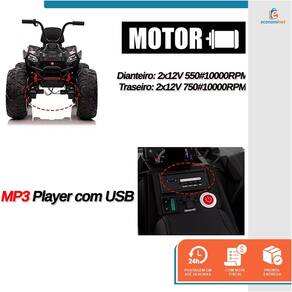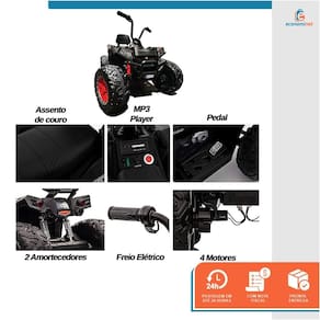 Características: Modelo: Quadriciclo Buggy Bateria: 12V para maior autonomia Motores: Quatro motores para maior potência Velocidade: Ajustável entre 3 e 8 km/h Suporte para MP3: Sim, para reproduzir músicas Peso Suportado: Até 50 kg Idade Recomendada: A partir de 3 anos Tempo de carregamento: 8-12 horas