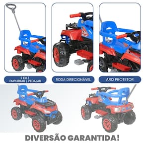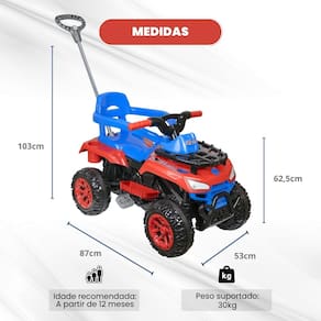 Benefícios e Características: - Aventura em Qualquer Terreno: Projetado para garantir uma condução segura e estável em qualquer ambiente. - Estilo Ousado: Design robusto e cores vibrantes que encantam os pequenos aventureiros. - Completo e Confortável: Acompanha empurrador, aro de proteção e apoio para os pés, oferecendo segurança e conforto.