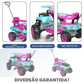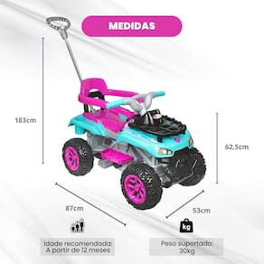 Benefícios e Características: - Aventura em Qualquer Terreno: Projetado para garantir uma condução segura e estável em qualquer ambiente. - Estilo Ousado: Design robusto e cores vibrantes que encantam os pequenos aventureiros. - Completo e Confortável: Acompanha empurrador, aro de proteção e apoio para os pés, oferecendo segurança e conforto.