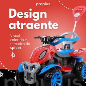 01 Quadriciclo Infantil Spider - Menino Lembre-se, este é mais do que apenas um brinquedo - é uma ferramenta de crescimento, diversão e aprendizado. Com o Quadriciclo Infantil Spider - Menino, cada dia será uma nova aventura para seu filho. Faça parte desta jornada e compre agora mesmo Homologação Inmetro: CE-BRI/ICEPEX-N 01264-25-128 Ean: 7894422148944
