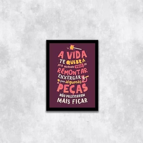 Quadro a vida te quebra pra você remontar 45x34cm - com vidro Moldura: madeira preta Informações do produto tire todas as suas dúvidas no descritivo abaixo: decoração para quarto, sala, cozinha, escritório, área gourmet e muito mais. Chega de paredes vazias medidas - cada peça tem 45x34cm a3 . Material do papel - papel fotográfico brilhante de altíssima resolução acabamento - todos os quadros são acompanhados de vidro para proteção da imagem. - moldura em madeira maciça na cor preta e pendurador . - os quadros são embalados de forma segura com plástico bolha com camada dupla de acordo com o tamanho dos quadros. - de 3 meses. Meu quadro chegou. Como posso fixá-lo Você precisa apenas de um martelo e um prego, pois os quadros já vão acompanhados de penduradores. Esta é a forma mais indicada. Como posso limpar meu quadro A limpeza é feita como um móvel comum da sua casa. Apenas um pano seco ou espanador são suficientes para tal