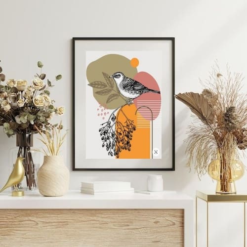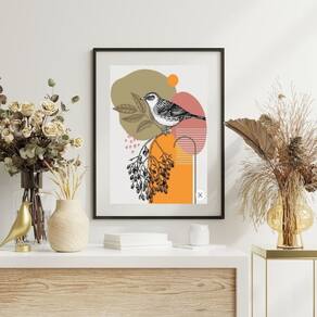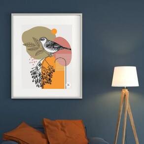 Quadro Abstrato Com Passarinho - 60x48cm - Moldura: Madeira branca