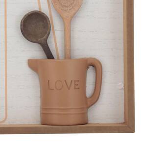 Com dimensões de 30cm x 30cm, o quadro apresenta uma base em madeira que emoldura uma criativa composição em fundo branco. O design mistura ilustrações lineares em tom suave de rosa com objetos em relevo, incluindo um recipiente no estilo de concreto com detalhe em corda e uma charmosa caneca com a palavra LOVE, complementada por utensílios decorativos.
