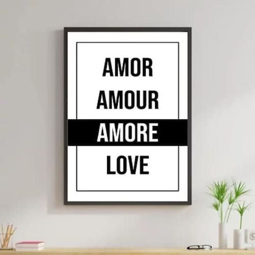 Quadro amor em várias línguas 24x18cm - com vidro Moldura: madeira preta Informações do produto tire todas as suas dúvidas no descritivo abaixo: decoração para quarto, sala, cozinha, escritório, área gourmet e muito mais. Chega de paredes vazias medidas - cada peça tem 24x18cm a5 . Material do papel - papel fotográfico brilhante de altíssima resolução acabamento - todos os quadros são acompanhados de vidro para proteção da imagem. - moldura em madeira maciça na cor preta e pendurador . - os quadros são embalados de forma segura com plástico bolha com camada dupla de acordo com o tamanho dos quadros. Garantia - garantia de 3 meses. Meu quadro chegou. Como posso fixá-lo Você precisa apenas de um martelo e um prego, pois os quadros já vão acompanhados de penduradores. Esta é a forma mais indicada. Como posso limpar meu quadro A limpeza é feita como um móvel comum da sua casa. Apenas um pano seco ou espanador são suficientes para tal