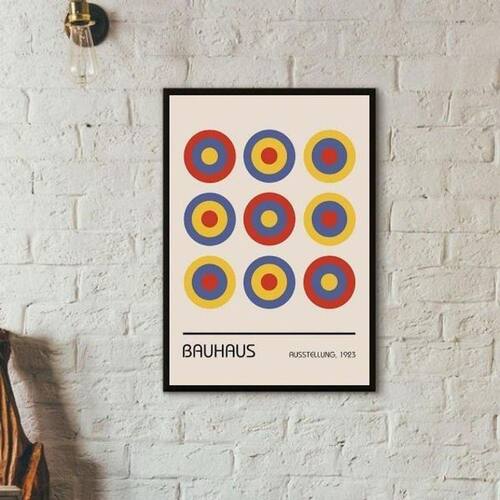 Quadro arte bauhaus - circulos ausstellung 45x34cm Moldura: madeira preta Informações do produto tire todas as suas dúvidas no descritivo abaixo: decoração para quarto, sala, cozinha, escritório, área gourmet e muito mais. Chega de paredes vazias. Medidas - cada peça tem 45x34cm a3 . Material do papel - papel fotográfico brilhante de altíssima resolução acabamento - todos os quadros são acompanhados de uma película de acetato para proteção da imagem. - os quadros são embalados de forma segura com plástico bolha com camada dupla de acordo com o tamanho dos quadros. Garantia - garantia de 3 meses. Meu quadro chegou. Como posso fixá-lo Você precisa apenas de um martelo e um prego, pois os quadros já vão acompanhados de penduradores. Esta é a forma mais indicada. Caso prefira, você pode utilizar uma fita dupla face neste caso, sugerimos de alta qualidade para evitar que descole e seu quadro caia . Como posso limpar meu quadro A limpeza é feita como um móvel comum da sua casa. Apenas um pano seco ou espanador são suficientes para tal