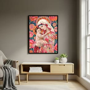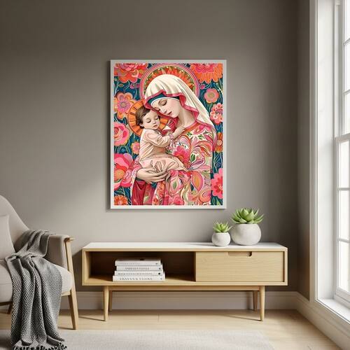 Quadro Arte de Virgem Maria Segurando Menino Jesus - 70x50cm - Cor: Moldura Branca